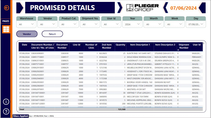 This Power BI dashboard is designed to provide a comprehensive overview of incoming logistics operations, focusing on orderliness, vendor performance, and return management. The dashboard is divided into three main pages, each offering detailed insights into different aspects of the logistics process.